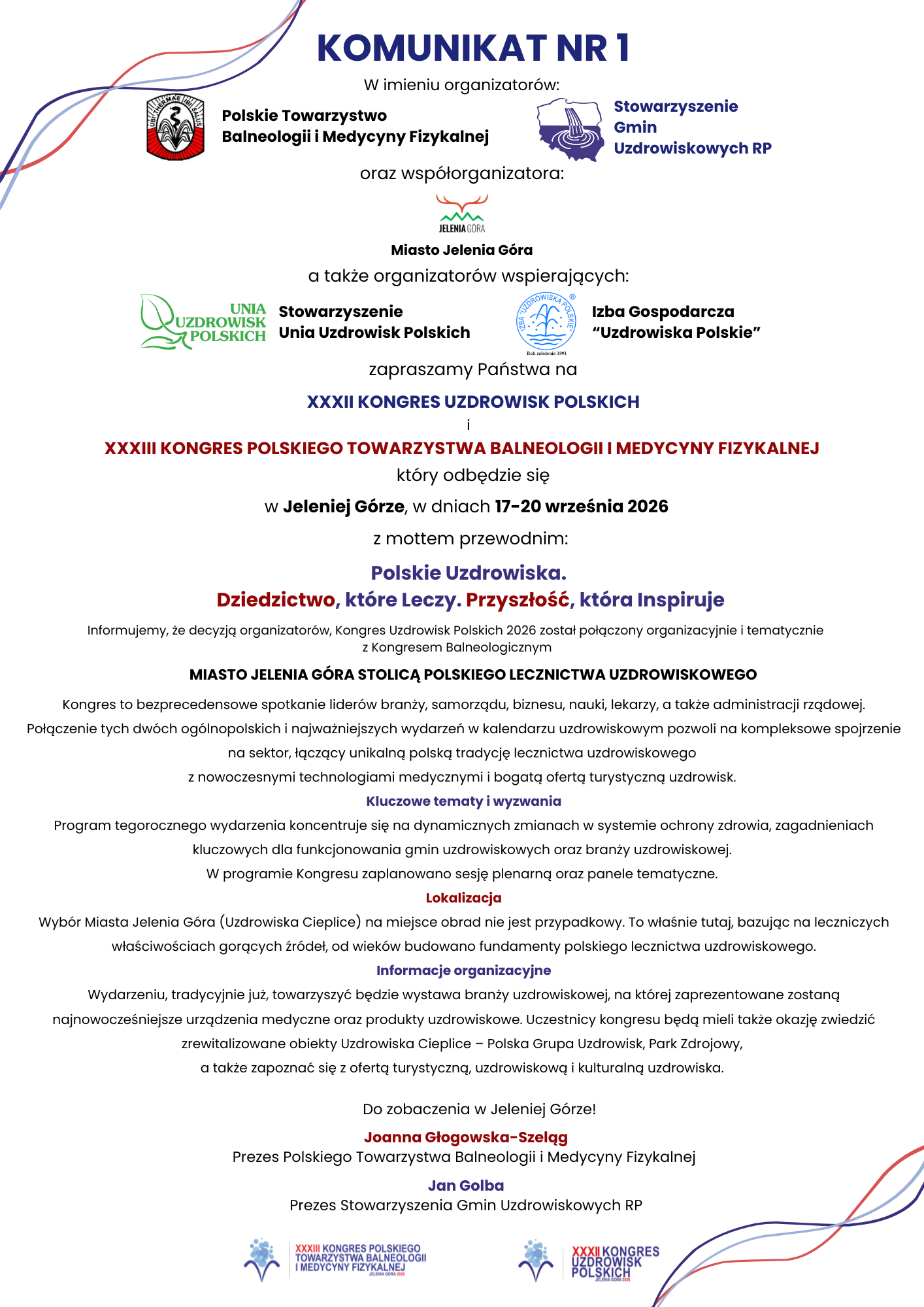 W dniach 17-20 września 2026 r. w Jeleniej Górze (Uzdrowisko Cieplice) odbędą się XXXII Kongres Uzdrowisk Polskich oraz XXXIII Kongres Polskiego Towarzystwa Balneologii i Medycyny Fizykalnej.